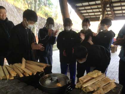 昼食は、野外炊飯でカレーうどんを作りました。とてもおいしかったです。準備も片付けも協力できました。