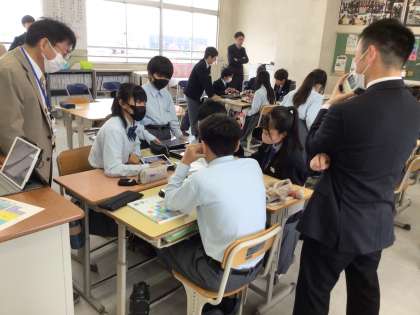1年1組にて、数学科の研究授業を行いました。グループ毎に与えられた図形の面積問題を、タブレット内のノートを使って解き、グループ内で解き方を共通理解を図った上で、他のグループの人に図形に色を入れながら説明していました。