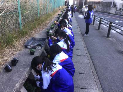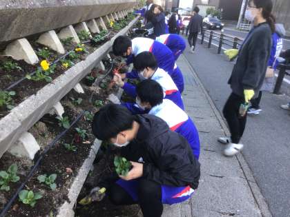 9日(火)にフラワーロードボランティアでパンジーの花を植える活動を行いました。2年生からも多くの生徒が参加し、きれいに見えるように配置を工夫しつつ、素早く多くの苗を植えていました。本校のシンボルの一つであり、生徒の手によって植えられた花が彩るフラワーロードをぜひご覧ください。