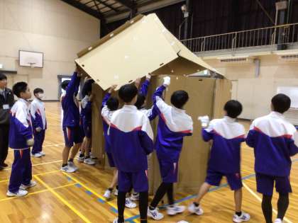 1年生 1/22(木) 防災学習を実施しました(避難所設営編) 公開日 2026/01/23 更新日 2026/01/23 学校生活の様子 豊田市保健衛生課動物愛護センターから3名の方を講師にお迎えし、ファミリー向けの避難用段ボールハウスの設営体験をしました。各班でリーダーを決めてリーダーの指示のもと組立手順説明書を見ながら設営に取り組みました。 1棟建てるのに30分以上かかりましたが、完成したハウスの中に入ることができた時には、嬉しそうでした。