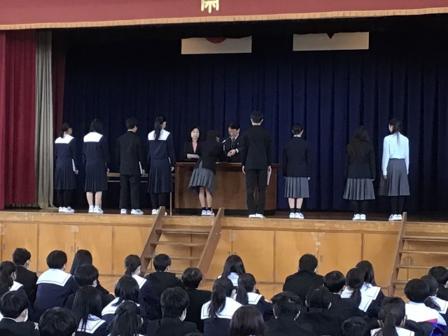 1校時の全校集会において、修了証授与式、令和8年度生徒会役員認証式及び各種表彰伝達を実施しました。修了証授与式では、学年主任の典礼に続いて、学年全員で大きな声で返事をし、一年を締めくくるにふさわしい態度で臨むことができました。また、令和8年度生徒会役員認証式では、1年生からは4名の生徒が認証されました。次年度の活躍に期待します。