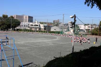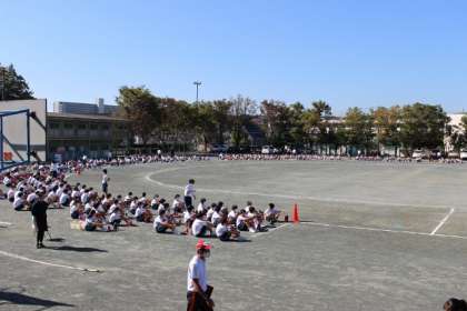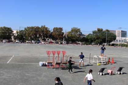 とても広いスペースを使って、生徒たちは応援席で待機しました。