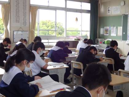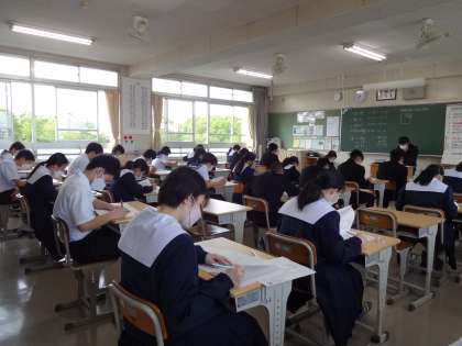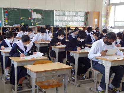 3年生が、国語・数学・理科・質問事項に取り組みました。この調査は、生徒たちの学力や学習状況を把握して、結果を今後の教育活動に役立てていくことを目的として、行われました。