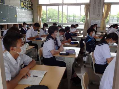 6時間目、3年生は、来週から始まる修学旅行のしおり読みを行っています。リモートで話される先生や級長会の話をメモを取りながら真剣に聞いています。
