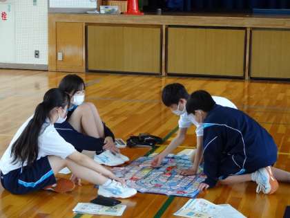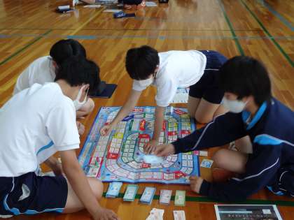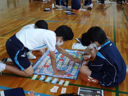 2年生が、総合的な学習の時間に第一フロンティア生命保険の方を招いて「ライフシミュレーションゲーム」を行いました。ライフサイクルの中で、自分で選択を行うことで、自分にあったライフスタイルを作ることができるということを模擬的に経験するものです。ボードゲームの形で行うライフプランニングは、とても楽しそうでした。今回はゲームでしたが、今後必ず、自分の人生の方向性を決定する時期があります。その時に、自分にとって充実した人生が送れるように選択してほしいです。