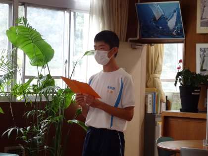 1時間目は、リモートでの全校集会でした。表彰伝達、3年生の意見発表、校長先生の話がありました。表彰伝達では、夏休み中にあったコンクールや大会の成果を校長先生に報告しました。意見発表では、「3年間の部活動を通して、今まで多くの人に支えられてきたので、これからは支えてくださった人たちに様々な形で感謝を伝えたい」と堂々と全校生徒に語りました。