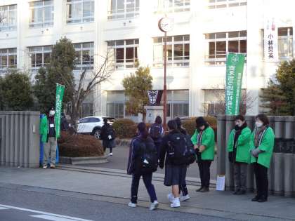 1月12日(木)の朝、民生委員・主任児童委員の皆さんが校門に立ち、生徒たちにあいさつを投げかけてくださいました。とても冷える朝でしたが、笑顔でさわやかな声をかけてくださったおかげで、気持ちよく学校生活を始めることができました。生徒の中には、民生委員さんや児童委員さんの目を見て、しっかりとあいさつをする姿も見られ、うれしく思いました。