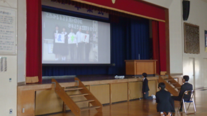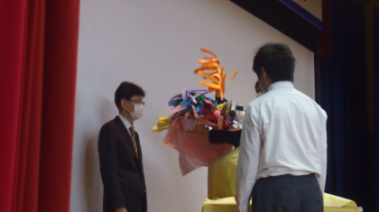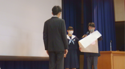 修了式の後、教員になってから38年間、今年度末に定年退職される校長先生の卒業式を行いました。これまでの経歴紹介やメッセージ入り花束の贈呈などがあり、在校生からの感謝の言葉を伝えました。コロナ禍の中、無事に教育活動ができたのも校長先生のおかげです。これまでありがとうございました。