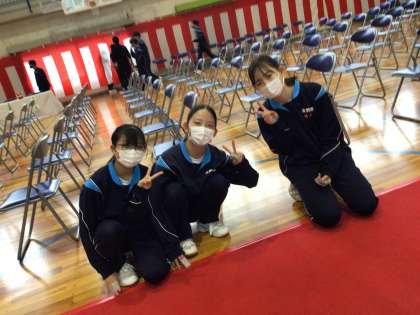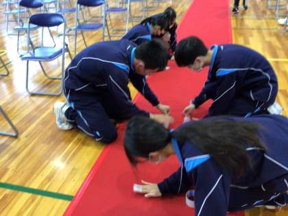 入学式の式場が出来上がってきました。最後の仕上げ、1年生が入場する赤い絨毯をガムテープできれいにしています。みんなで心を込めてペタペタ。ありがとう!(とびっきりの笑顔もありがとう!)