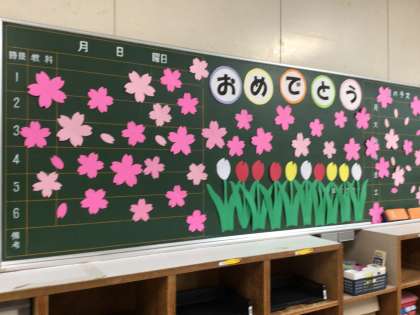 3年生の生徒が下校した後も、入学式準備は続いています。各学級の机の上には配付物が置かれ、教室や廊下には入学を祝うメッセージが飾られています。先生たちの準備は、今日もまだまだ続きそうです。