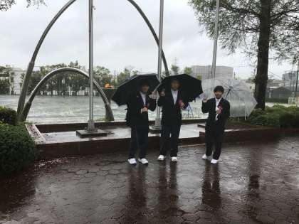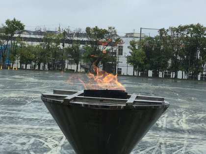 運動場を見下ろす場所に立つモニュメント。特別な時に、このモニュメントに火(炬火)が灯ります。毎日が特別な日なのですが、末野原中にとって特に特別な日である入学式、卒業式、そして全校が熱く燃える体育祭に火が灯ります。今日は特別な日。雨の中、校務主任が火を灯してくれました。