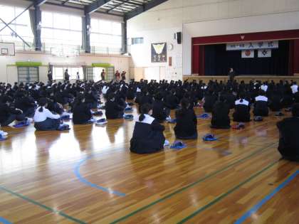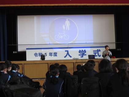 また、授業終了後、自転車通学者を対象に、体育館にて「自転車通学の安全指導」を行いました。自転車に乗るときの交通ルールやマナー、気をつけたいことを、スライドを使って確認しました。自転車はとても便利な乗り物ですが、軽車両です。事故を起こしてしまうと、大きなけがにつながることもあります。安全に注意して利用していきたいですね。