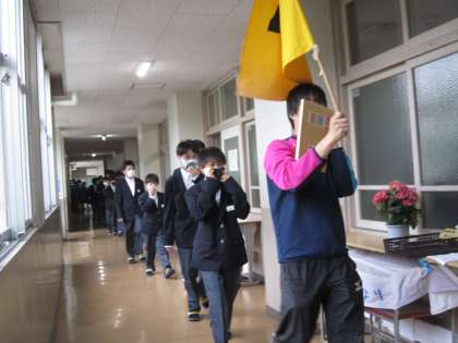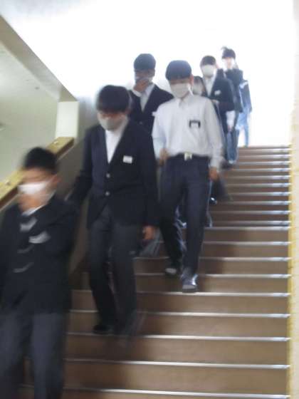 雨天で、グラウンドでの集合はできませんでしたが、避難経路の確認をしました。