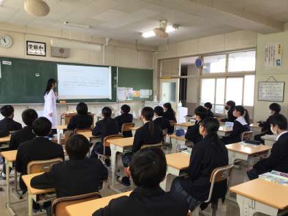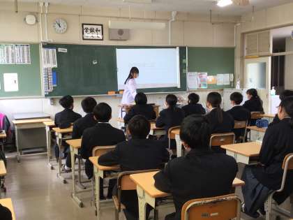 少しおなかも空いてくる時間です。1年生の廊下を歩いていると数学、国語、理科、英語、いろいろな教科の授業の声が聞こえてきます。写真は1年4組の様子です。生徒の眼差しや姿勢が素晴らしいなと思い、足を止めました。理科の教科担任の先生が「理科ってどんな教科か」という話をしていました。改めて考えてみたことがなかったのですが、とても大切なお話です。