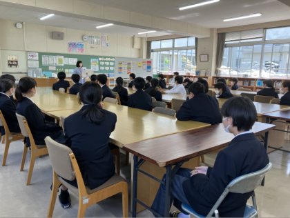 1年生に図書館利用指導を行いました。図書館司書さんから図書館内は静かに利用し、密にならないことや期日を守って借りることが伝えられました。今年度も図書館を多くの生徒が利用してほしいです。