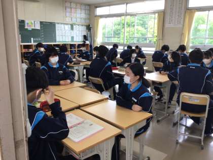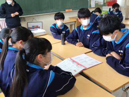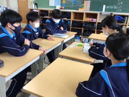 3年生のクラスの朝の会の様子です。今日の目標を班で話し合って決めていました。