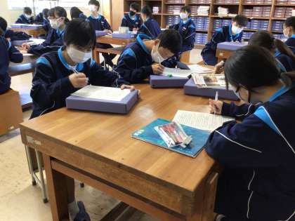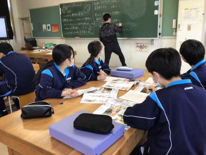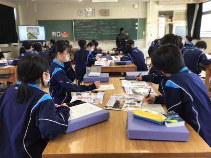 5時間目です。2年7組の美術の授業にお邪魔しました。ミロのビーナスなどは有名ですが、もっともっと昔の時代、ラスコーの壁画や土偶など、はるか昔から人々は表現してきたという美術史を学んでいました。美しいものや興味があるものを絵や形で表したいという気持ちは、人間が本能的にもっているものかもしれませんね。