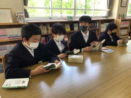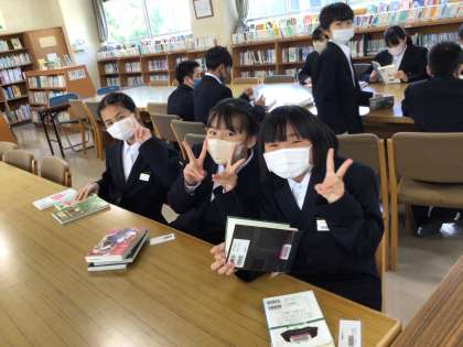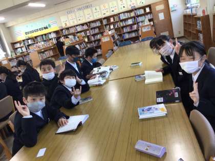 図書室では1年2組が国語の授業をしていました。中学校でも図書室はよく使いますので、使い方を学びます。「小学校とは置いてある本の種類が違います」と話す1年生。たくさん本を読んでくださいね。