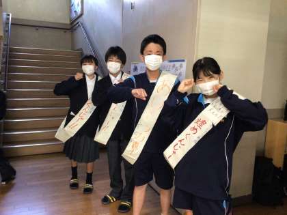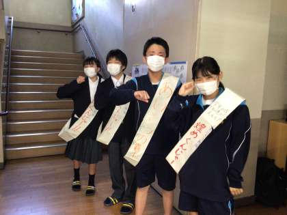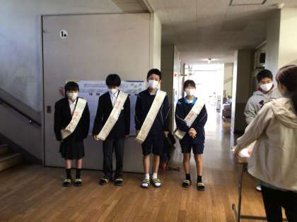 おはようございます。世の中はゴールデンウィークに入っていてすっかりお休みモードですが、生徒は元気に登校してきました。1年生の級長会が動き始めました。タスキをかけてあいさつ運動をしていました。爽やかな笑顔とあいさつがとてもいいです。タブレットでパチリ。写真に収まってくれてありがとう。みんなで挨拶を盛り上げていってくださいね。