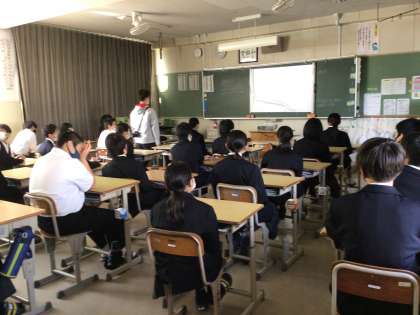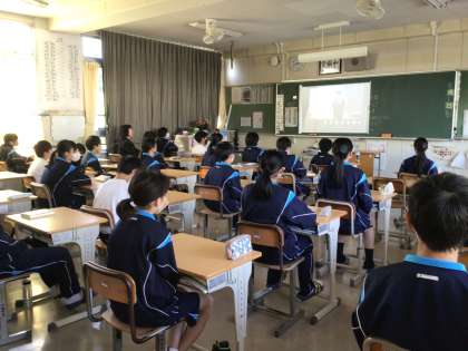 級長会の話をしっかり聞いている生徒たちです。写真は1年4組、5組、6組です。