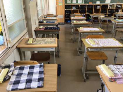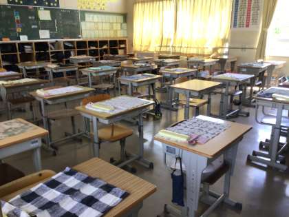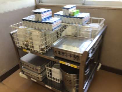 2年4組は3、4時間目技術家庭科です。教室には給食準備がされています。先を読んでの行動、いいですね。さすが2年生。しかも、あれ??発見しました、箸セットがみんなランチョンマットの右側に揃えて置いてあります。おかずを置くのに便利だからでしょうか。何か理由がありそうですね。