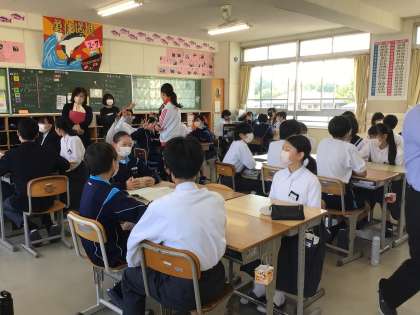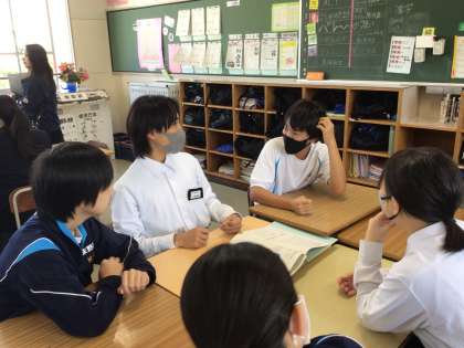 2年7組の班活動の様子です。こうした活動は他のクラスでも始まりつつあり、今日は、生徒が読書をしている時間帯を利用して他の学級の先生たちも活動の様子を見にきていました。