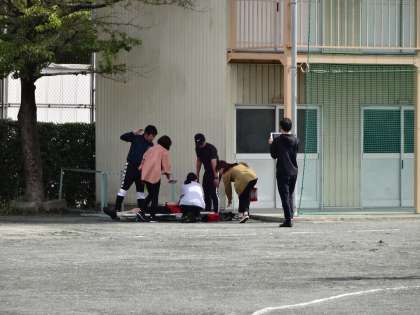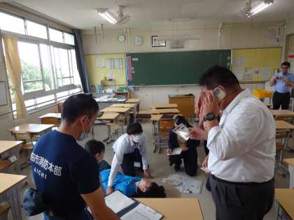今日は、生徒の下校後、南消防署末野原分署の職員の指導を受けながら、シミュレーション訓練研修を行いました。1.授業中、てんかんの発作が出た場合2.プールで、生徒がけがをした場合3.運動場での体育祭練習で、生徒たちの体調が悪くなった場合についての訓練を行いました。先生たちは、実際にこのようなことが起こったら、また、自分しかその場にいないときに、どうやって迅速に命を救うのかということ考えながら、真剣に研修をしました。今までも、何度も研修をおこなっていますが、生徒の命にかかわる研修にやりすぎということありません。これからも、このような研修に取り組んでいきたいと思っています。