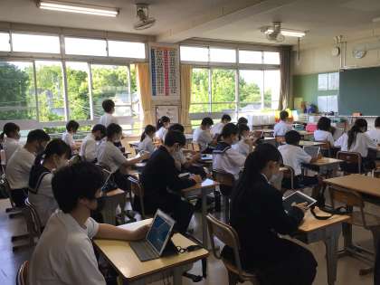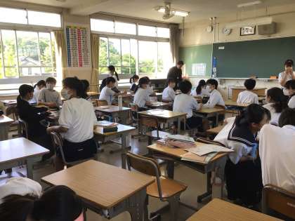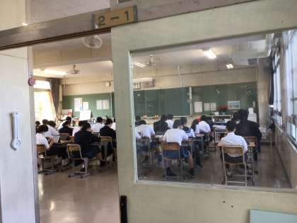 5月後半に入りました。3年生はいよいよ来週が修学旅行です。今日は気温が30度近くまで上がるとのことです。クールビズで涼しい服装をしている生徒が増えました。上に2枚の写真は2年生教室の様子です。3枚目の写真は1年生教室です。