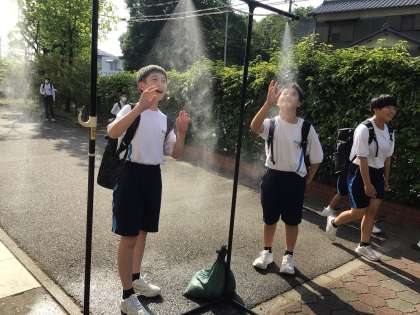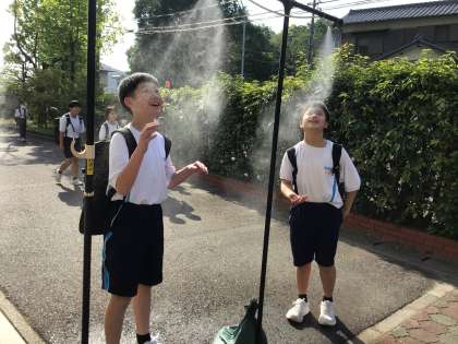 今日はこの写真から。昨日から昇降口にミストが登場しています。今朝も生徒昇降口で稼働しています。写真はミストを浴びる少年たち。快諾して写真に収まってくれました。このミストは先生が手作りした支柱に市販のホースを繋げて作ってあります。部活動の大会などにも持っていく部があります。暑いですが今日も一日がんばりましょう。
