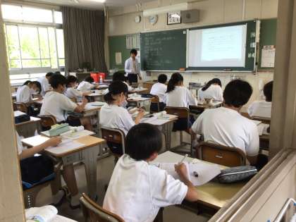 5時間目、1年2組は理科です。脊椎動物について学習していました。生徒は興味津々。授業をのぞいた時は、皮膚の働きについて考えていました。