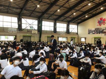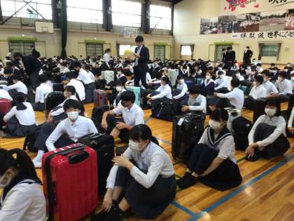 まもなく出発式。健康観察カードを提出して生徒が集まっています。一番下の写真は出発式を担当する級長会のメンバーです。みなさん、昨夜はよく眠れましたか。いよいよ修学旅行です!
