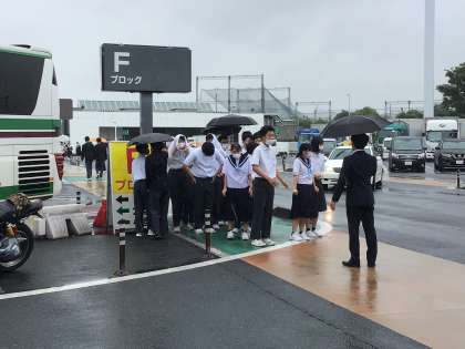 車内は暖かいですが、外は天気予報どおり肌寒いです。上着や防寒着など羽織るものを持ってくるようにと集会で話がありましたが、風邪をひかないように各自着るもので調整しましょう。今から都内にバスを進め、最初の目的地である国会議事堂に行きます。