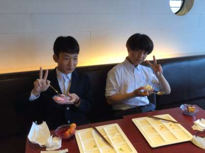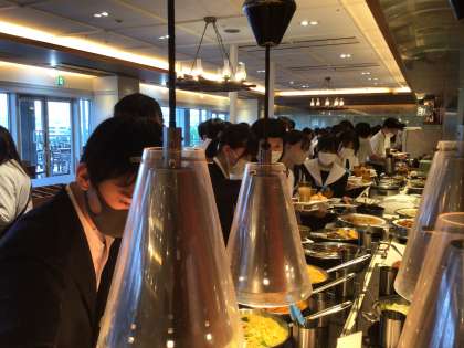 料理を取っています。食べています。真ん中の写真はデザート男子。