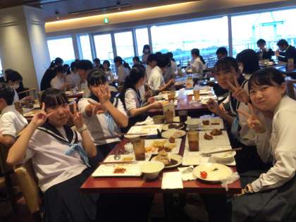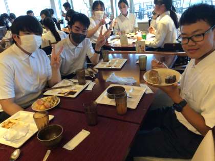 食べています。生徒が食べ始めてから食べている先生たち。カレーをかき込んでいます。