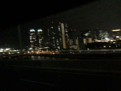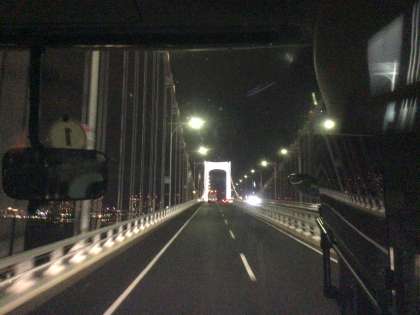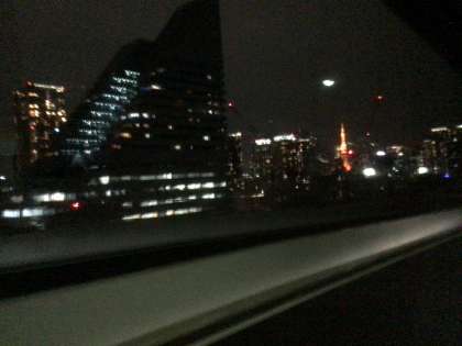 レインボーブリッジ通過中。遠くに東京タワーも見えます。雲が切れてきました。道路も乾き始めています。明日は良い天気になりそうです。今日は雨模様でしたが国会議事堂ぐらいしか傘を使うことがなく、思いのほか雨の影響は少なかったです。