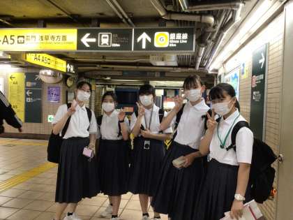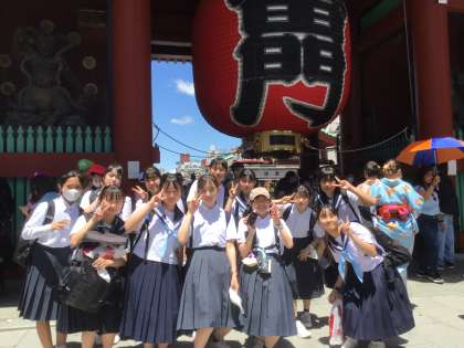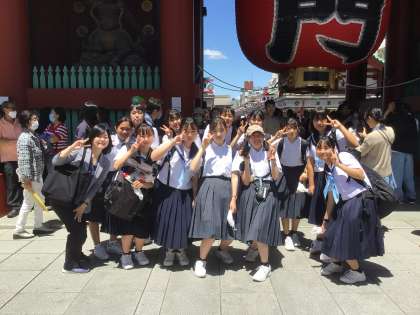 雷門前は人だかりです。空いた隙に記念写真。駅の構内でも生徒たちに会いました。何を食べたのか尋ねたところ「いろいろです」と笑顔で答えが返ってきました。仲見世通りでいろいろ食べたのかな?