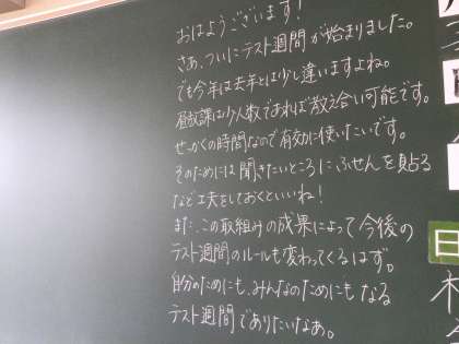 校内を一回りしてきました。この写真は2年生フロアの様子です。今日から中間テスト週間。各学年で学習に向かう雰囲気を作っています。のぞいたトイレは、どこもスリッパが綺麗に揃っていました。