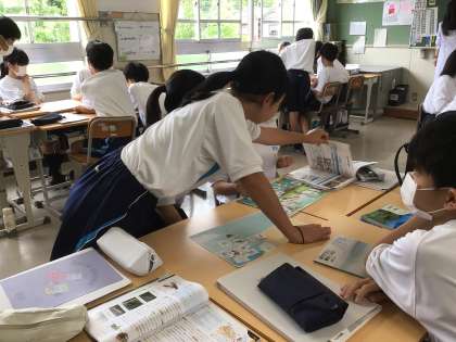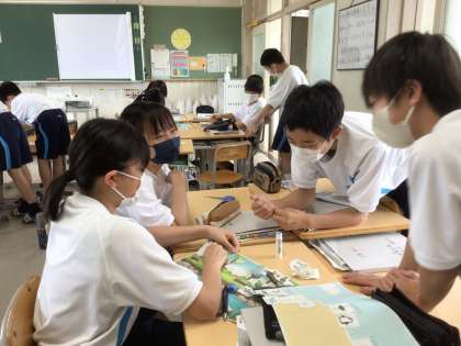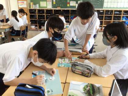 1年4組の理科の授業の様子です。活発に話す声が聞こえてきました。生徒が班に分かれて何かを囲んで盛んに話しながら作業をしています。先生が準備したシートに、生き物が描かれたカードを分類しながら、のりで貼り付けていました。