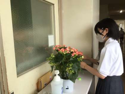 1年生廊下にあるベゴニアの鉢に水をやっている生徒を発見。係なのかな、と聞いてみたところ、係ではなくボランティアでした。優しい行動です。ありがとう。ベゴニアも喜んでいることでしょう。