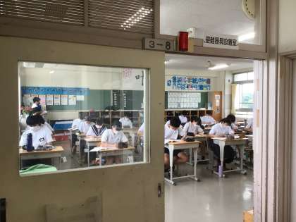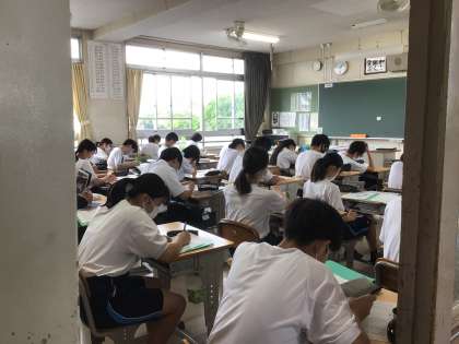 8時5分過ぎの3年生教室。すでに生徒たちはテスト勉強を始めていました。寸暇を惜しんでテストに向けて学習する姿が見られます。学年のフロア全体が朝から学習モードになっています。寝不足だと思います。きっと眠いでしょう。自分との戦いですね。