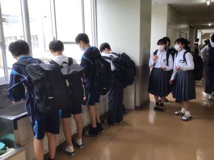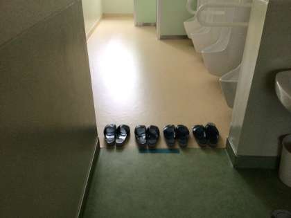 生徒が続々と登校しています。7時50分。今朝も綺麗にそろったスリッパ。どの学年のどのトイレをのぞいてもスリッパがこのような状態です。素晴らしい。