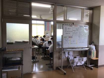 3時間目の様子です。5教科あるうちの最後のテストです。この写真は2年生です。科目は数学。タブレットのシャッターの音すら邪魔になるぐらい集中していると思いますので、離れたところから少しだけ撮りました。