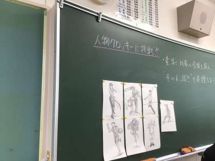 美術室にお邪魔しました。物音が全くしない静けさの中で生徒が人物のクロッキーを描いていました。ポイントは、素早く全体の形を捉えることと、その人っぽさを表現することだそうです。黒板には先生が描いたクロッキーが何枚か貼ってありました。クロッキーは素早く、例えば7、8分ぐらいでささっと描くのだそうです。「その人っぽさ」という視点は目からウロコでした。初めて学んだ視点でした。なるほど!
