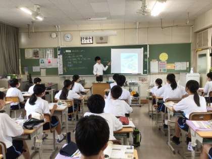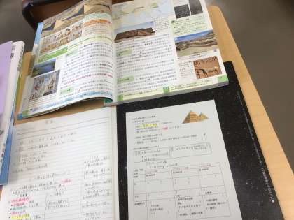 3時間目の様子です。1年4組は社会です。ここまでの学習で、生徒は「川のそばで文明が栄えた」ということを発見したようです。教科書のピラミッドの写真を見て、ピラミッドは何のために作られたのか学習していました。和やかな雰囲気で授業が進んでいきました。しっかりとノートやワークシートにまとめ、手を挙げて意見を発表する生徒の姿がありました。ワークシートがとても綺麗だったので写真に撮らせてもらいました。