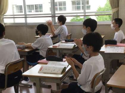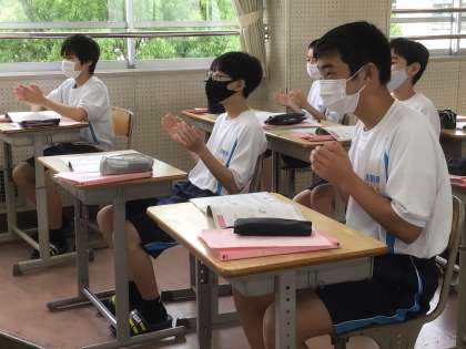 今日の音楽は歌唱(朝の風に、という曲です)とリズムアンサンブル。シンコペーションのリズムを使い、自分が考えたリズムも組み合わせてリズムの良さを味わいます。とても楽しそうな雰囲気で授業が進んでいます。全員のリズムがバッチリ決まったときには生徒の笑みがこぼれます。