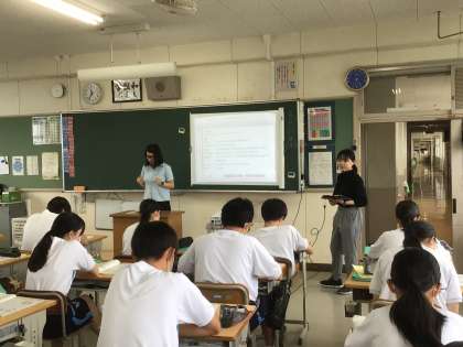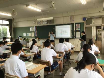 3年生の英語はTT(チームティーチング)で行っています。今日はさらにALT(外国語指導助手)が加わって3人体制で指導しています。ほとんどオールイングリッシュで授業が進みます。
