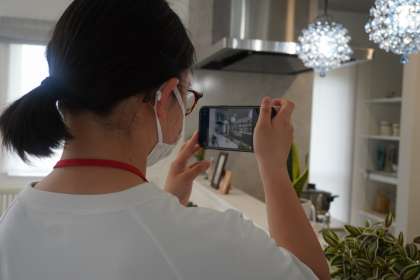 上の写真はアパートの賃貸会社で体験している様子です。部屋の写真を撮っているのでしょう。きれいに写真を撮ると、「このお部屋に住みたい」という気持ちで借りてくれる人が増えそうですね。
