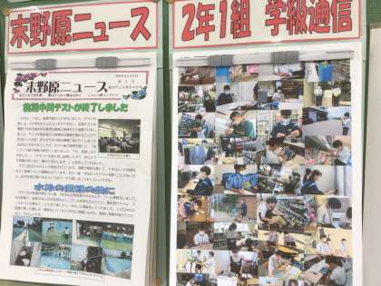 教室の掲示板には、さっそく職場体験についてのお便りが掲示されていました。写真もたくさんです。