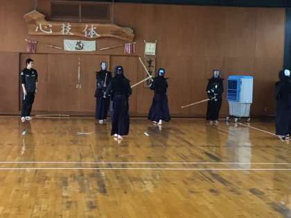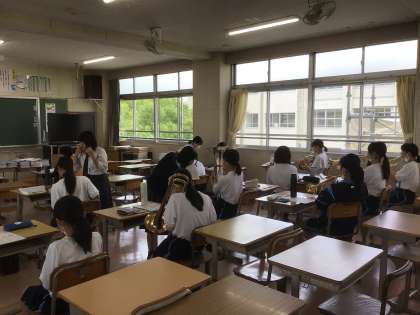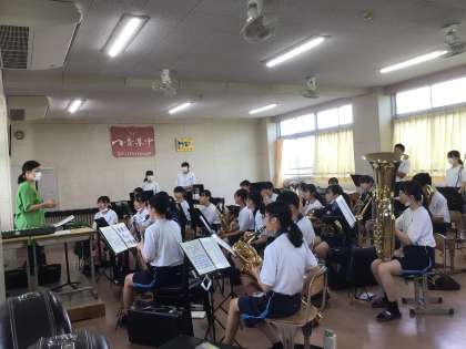 試合のない部活動は本番に備えて練習しています。吹奏楽は外部講師の先生がマーチの指導をしてくださっています。剣道部は武道場で頑張っています。