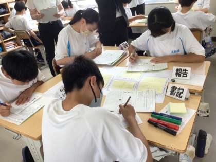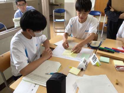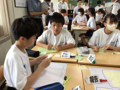 班での話し合いの様子を他班の生徒が見て、良いところをカードに書いて伝えます。